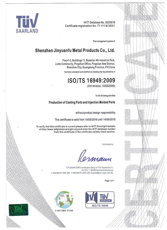 深圳市金源福五金制品有限公司成立于2003年。公司擁有8000多平方米生產廠地、開發(fā)與管理精英人才、技術專業(yè)、設備精良、交通便利、服務周全、具體設計、開發(fā)、制模、出樣、生產到成品出貨一體化模式生產廠家。已通過ISO9001:2008ISO1440/TS16949:2009國際質量體系認證。專業(yè)生產鋅合金壓鑄、鋁合金壓鑄產品、汽車配件、汽車后視鏡支架、車載導航散熱器、LED散熱器、LED燈罩、數(shù)碼電子五金結構件、家具五金裝飾件、標牌(LOGO)等五金壓鑄產品。